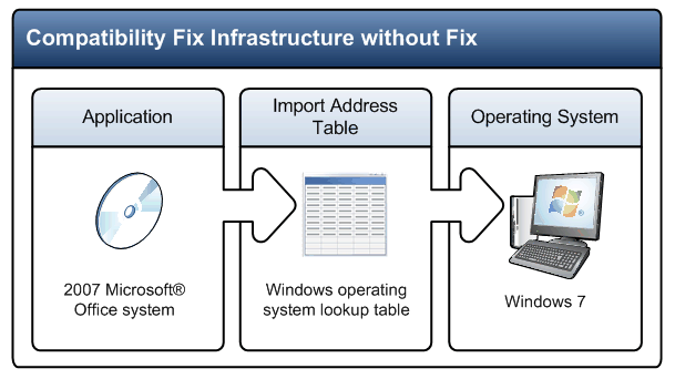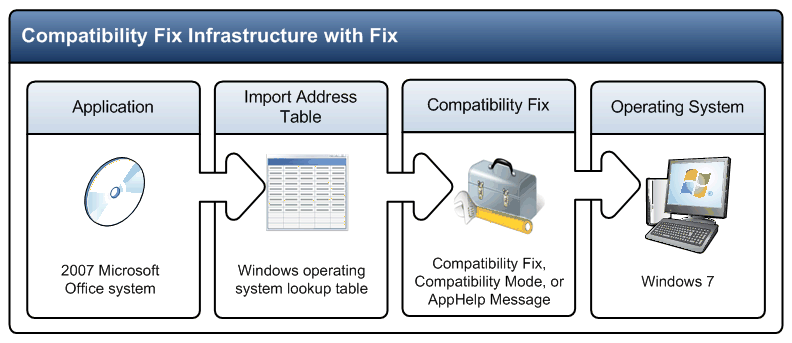Application experience and compatibility on the various Windows® operating systems is one of the fundamental pillars of Windows development, along with performance, reliability, and manageability. To reduce deployment costs and accelerate adoption, Microsoft invests in deep technical solutions that ensure broad compatibility with existing software and drives compatibility into the engineering and release process. One such solution is the Microsoft Windows Application Compatibility Infrastructure (also known as the Compatibility Fix infrastructure). As the operating system evolves from version to version to support new technology, to support new features and functionality, and to incorporate bug fixes, the implementations used by some functions may change, causing problems for the applications that relied upon the original implementation. Due to the nature of software, modifying the function again to resolve this compatibility issue could break additional applications.
