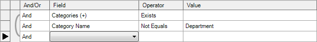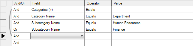 The following example is a query for all applications assigned to the category of Department and the subcategory of either Human Resources or Finance.
