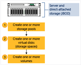 This topic describes how to deploy Storage Spaces on a stand-alone Windows Server 2012−based server. For information about how to create a clustered storage space, see Deploy a Storage Spaces cluster on Windows Server 2012 R2.