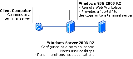 When you deploy an additional server that is configured with Terminal Services, you reduce the risk that a single hardware failure can disrupt your business. You can also add capacity to the server without disrupting other services on your network that Windows SBS 2003 R2 manages. For nearly all businesses that want to manage user desktops or user applications, this is the recommended method for adding Terminal Services to your network.