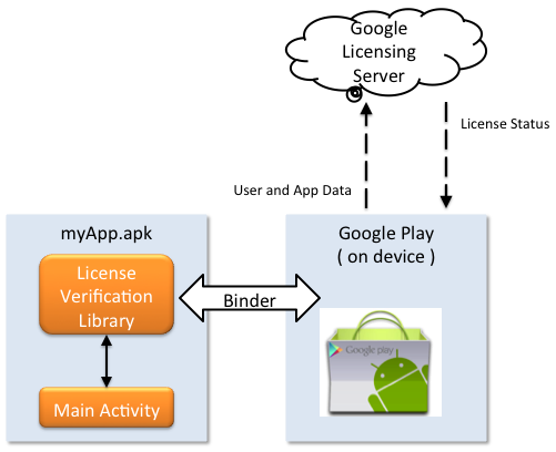 An application that has implemented Google Licensing makes a request to a service hosted by the Google Play application on the device. Google Play then sends this request on to the Google Licensing server, which responds with the license status: