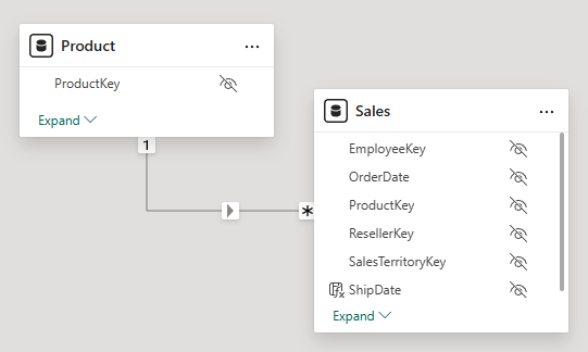 For example, the ProductKey column in the Product table has a one-to-many relationship with the ProductKey column in the Sales table.
