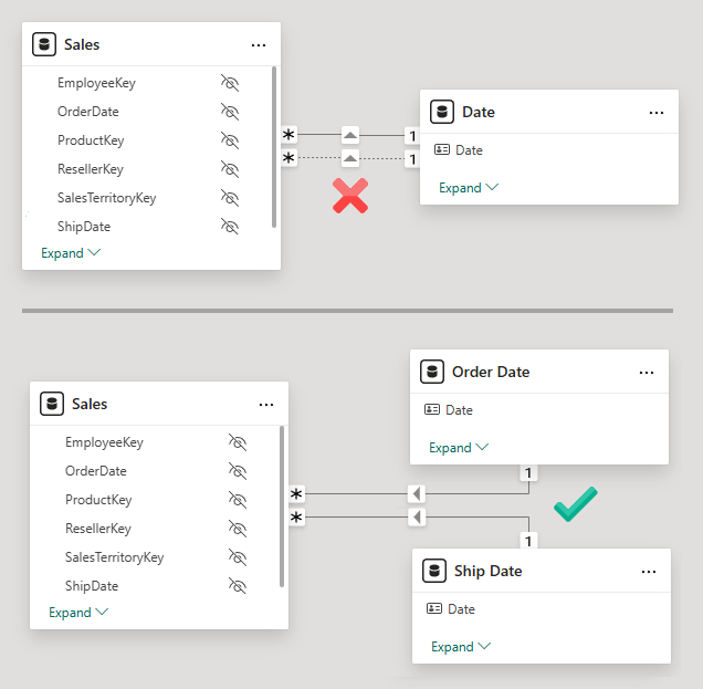 The following screenshot compares two model design scenarios. The first scenario shows a single date table with an active and inactive relationship. The second scenario shows two dates tables, each with active relationships. (Active relationships are represented by solid lines; inactive relationships are represented by dotted lines.)