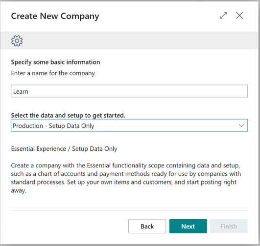 You can use the Production - Setup Data Only option in the create new company wizard, to create a company with setup data but without sample data. This process creates a company containing data and setup, such as a chart of accounts and payment methods ready for use by companies with standard processes. Set up your own items and customers and start posting right away.