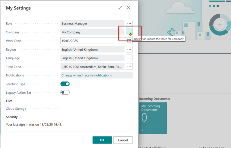 In the My Settings page, open the assist edit button to the right of the Company textbox.