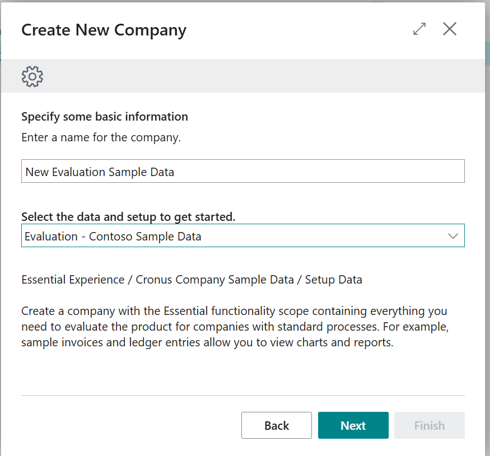 If you want to get started quickly with a new company that contains setup and demo data, then the option Evaluation - Contoso Sample Data is the best choice.