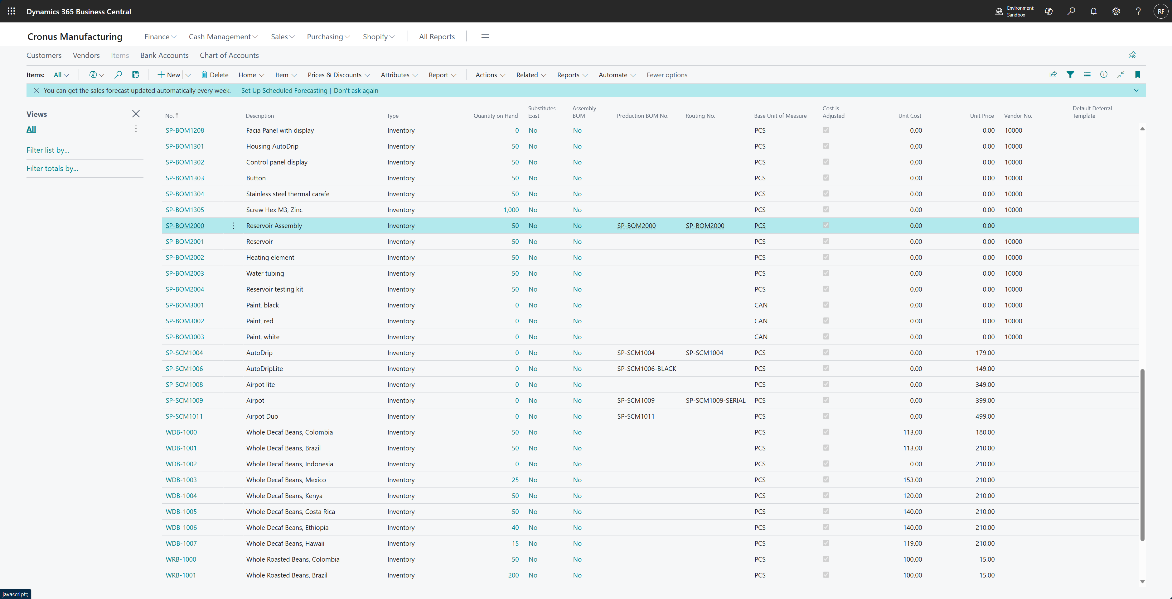 The demo company with other demo data is a coffee machine manufacturing company that requires the services of Business Central. It adds the following manufacturing master data:
