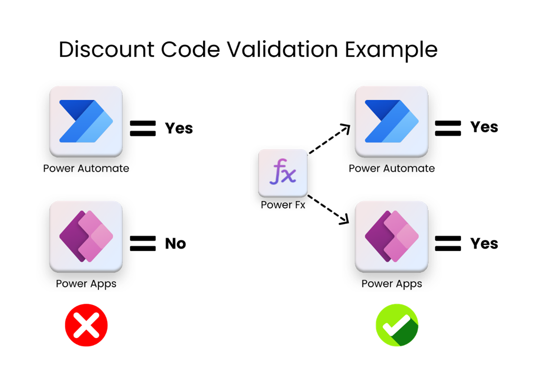 Recall the previous scenario of calculating discount codes. Instead of duplicating logic across multiple apps, you can use a single function for validating and applying a discount across various applications and automations, which would ensure consistent calculation every time. In this scenario, by using Power Fx functions, you can maintain your data hygiene while also reducing your workload by eliminating the need to update your calculation in multiple places.