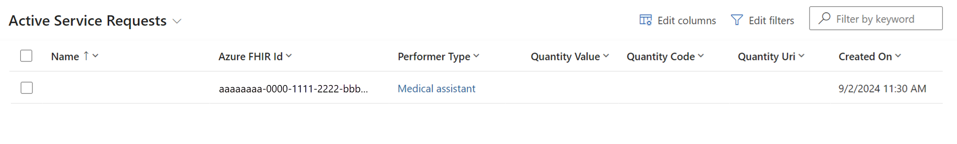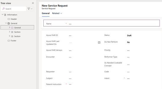 To view the Service Request data, you need to configure the primary form and some associated views. Once you create the records using the Dataverse Healthcare APIs, you can view the list of records and open the Service Request main form to view the detailed column data and the related child records.