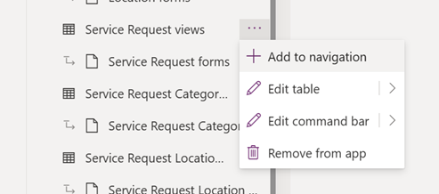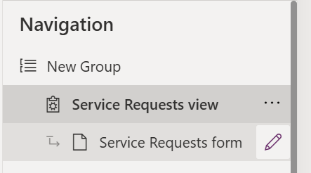 In the App designer Pages pane, under All other pages, select the Service Request views item horizontal ellipses.