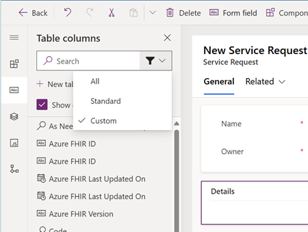 In the left navigation, select Table columns, and filter by Custom in the Search area.