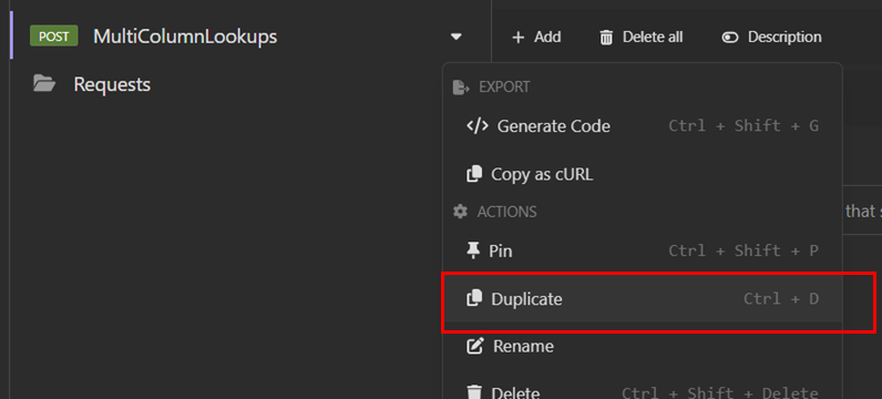 Select the HTTP request named MultiColumnLookups and right-click to open the context menu.