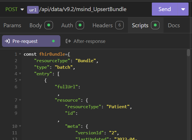 In the Pre-request script, replace the value of the fhirBundle constant, currently set to {}, with the contents of ServiceRequest_One.json.