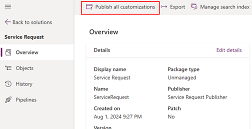 Property Value Name Service Request Testing Description Testing data model and transformation maps Use components from a solution Checked Solution Service Request Site map Default site map Select Create.
