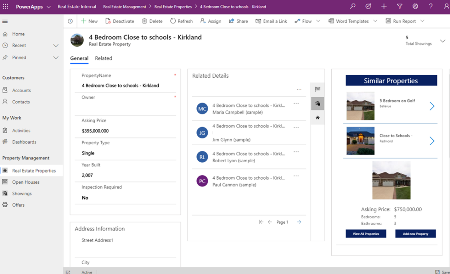 Under the Property Management group, managers can easily access things like the real estate properties that are currently for sale. As they open a specific property, they're presented with basic information such as the property type, asking price, and the year built. In the Related Details section, we have access to any open houses, showings, and offers associated with this property. This information provides managers with everything associated with this property from a single screen without needing to navigate to different areas of the application.