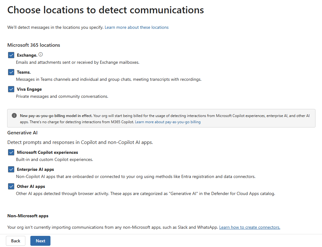 On the Choose locations to detect communications page, select which locations and communication directions to include, such as Exchange, Teams, Viva Engage, or Microsoft 365 Copilot content.
