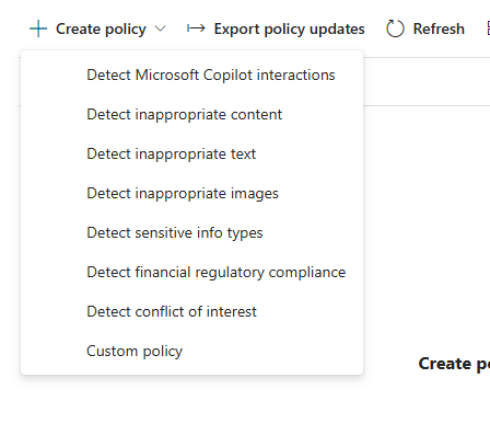 To create a communication compliance policy, go to the Communication compliance solution in the Microsoft Purview portal and select Policies.