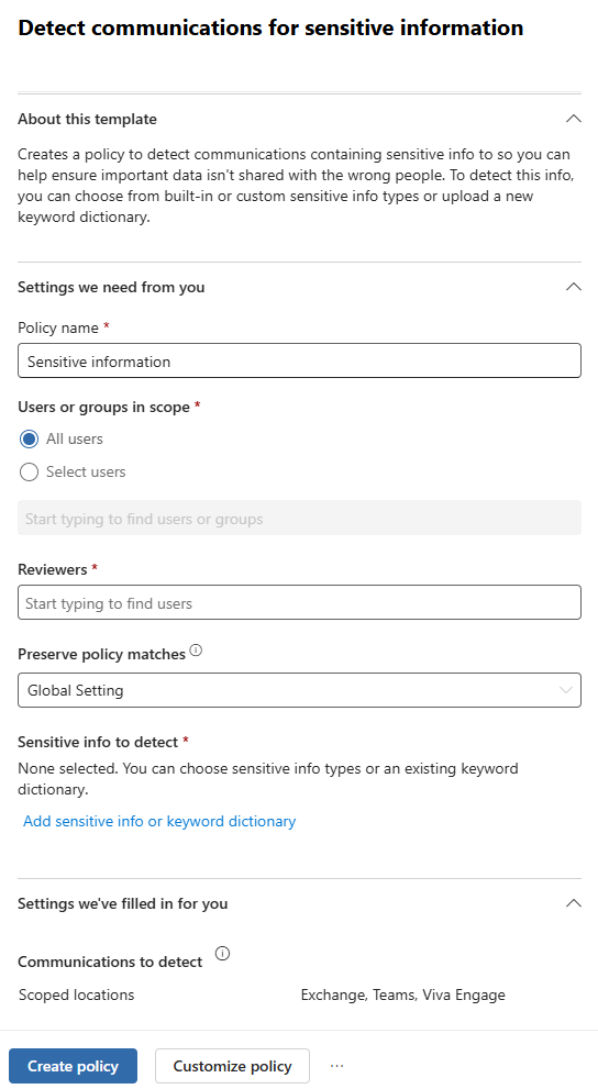 Templates automatically configure locations, communication directions, and detection signals. You still need to choose reviewers, define the policy scope, and customize other settings if needed.
