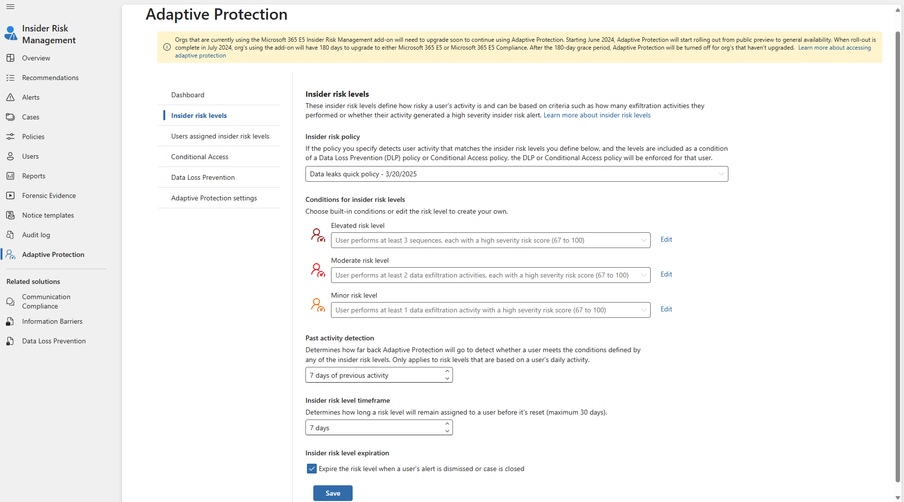 Risk levels in Adaptive Protection define how risky a user's activity is. Risk levels can be based on criteria such as how many exfiltration activities they performed or whether their activity generated a high severity insider risk alert. These risk levels have built-in risk level definitions, but these definitions can be customized as needed:
