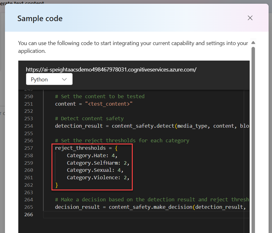 If you choose to start configuring filters and testing the model's detection capabilities within Azure AI Foundry, be sure to use the sample code that's provided for each Azure AI Content Safety feature.