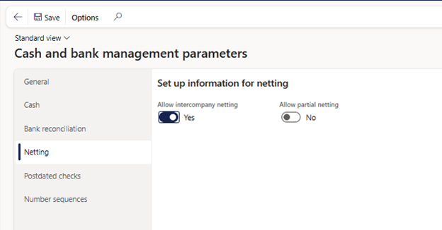 Enable intercompany netting by navigating to Cash and bank management > Setup > Cash and bank management parameters and selecting Allow intercompany netting.