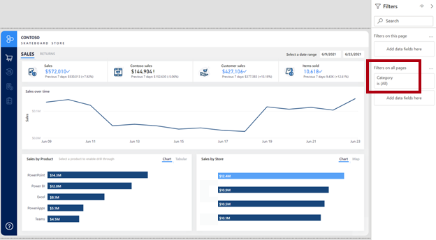 The first attempt added the Category field to the Filters on all pages section of the Data pane. The report author decided that it was a quick and easy update to make.