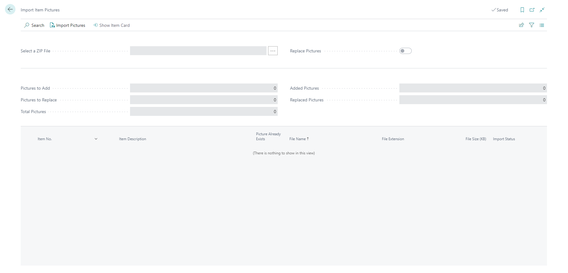 In the Select a ZIP file field, select the relevant .zip file and then select the Open button. A line for each item and picture is created on the Import Item Pictures page.