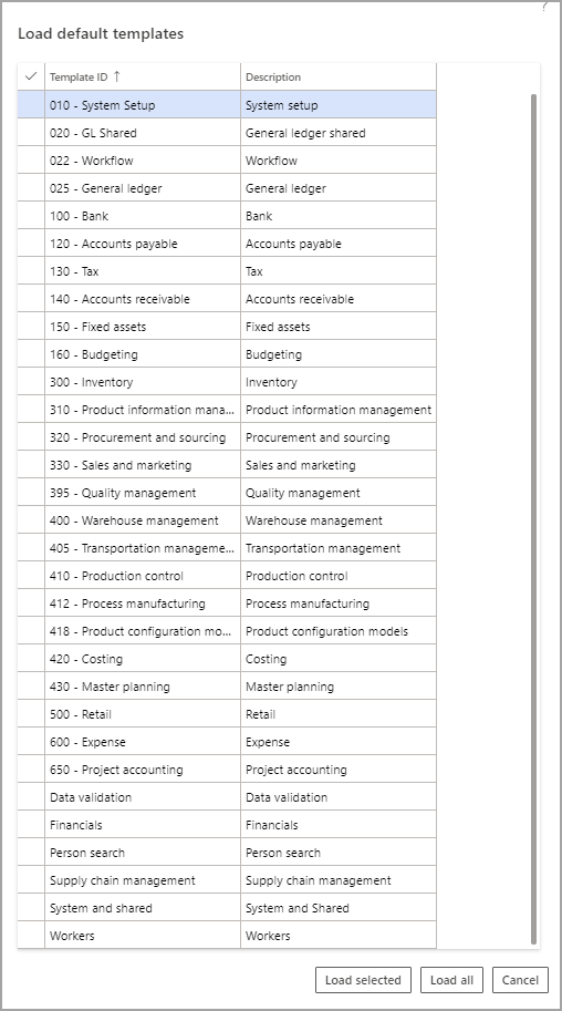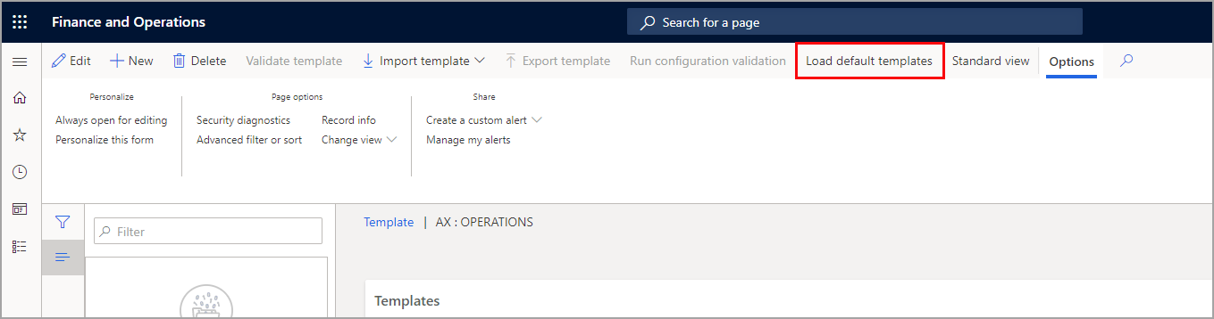Default templates are delivered together with each new release of finance and operations apps. Our long-term goal is to provide the templates in Lifecycle Services so that you can push them to an instance of finance and operations apps. However, for the current releases, select the Templates tile in the Data management workspace, and then select Load default templates to load the templates. To see the Load default templates menu, you must use Enhanced view.