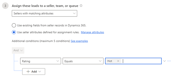 Seller with matching attributes - Assign leads to sellers who satisfy the conditions that are defined through attributes that are selected from Dynamics 365 or assignment rules. The following options are available: