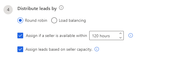 Assign leads based on seller capacity (optional) - Select this option to consider the maximum number of leads that a seller can handle at once. For more information, see Set lead capacity for sellers.