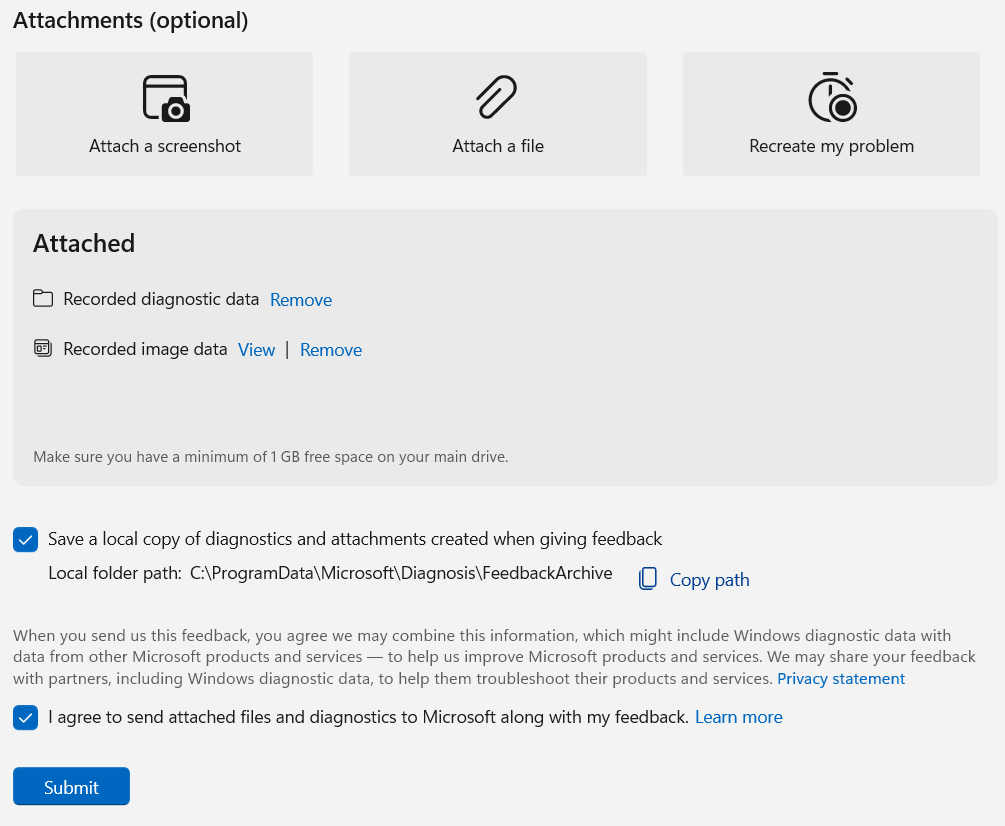 If everything is correct, select Save a local copy of diagnostics and I agree to send attached files.