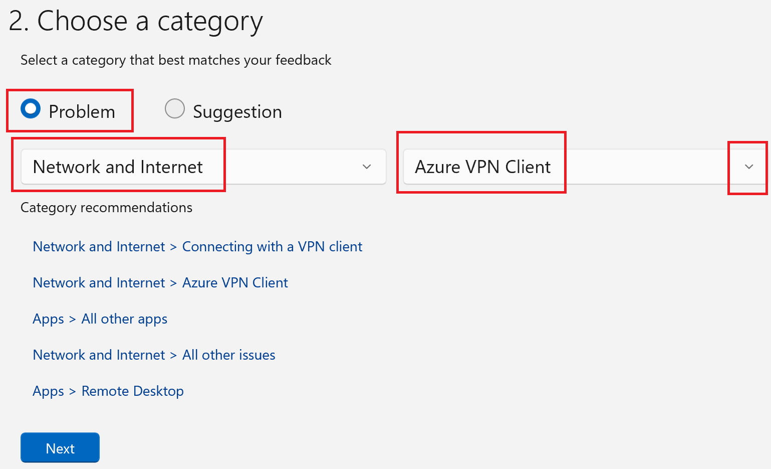Under Choose a category, select whether this is a Problem or a Suggestion.