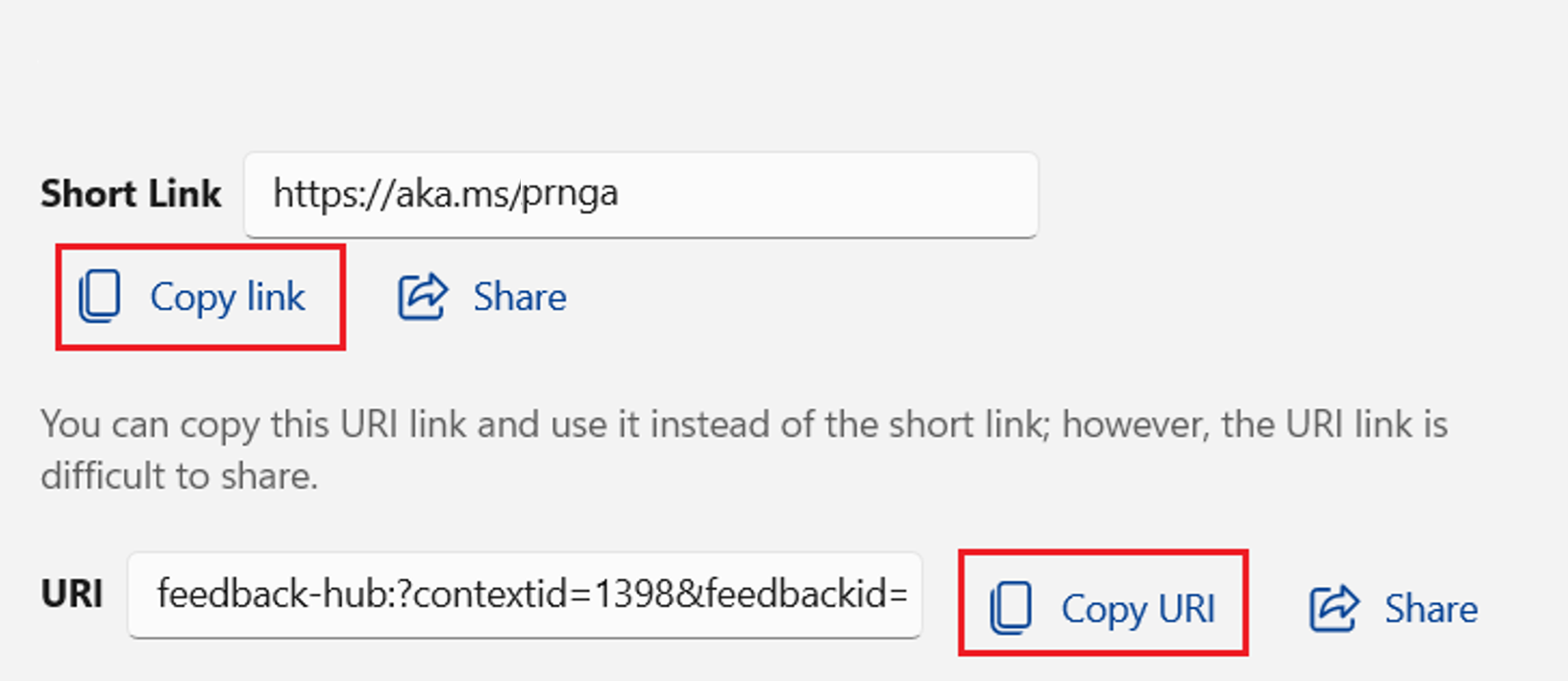 Select Other sharing option to access the URI associated with the diagnostic logs that were sent to Microsoft.