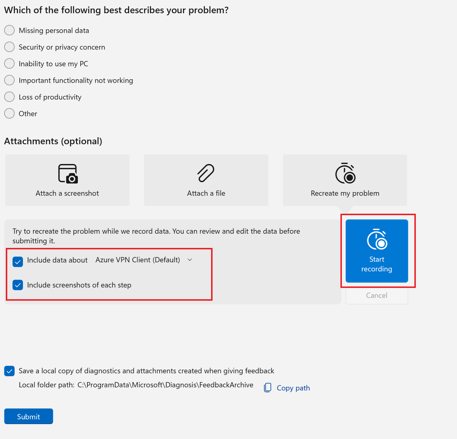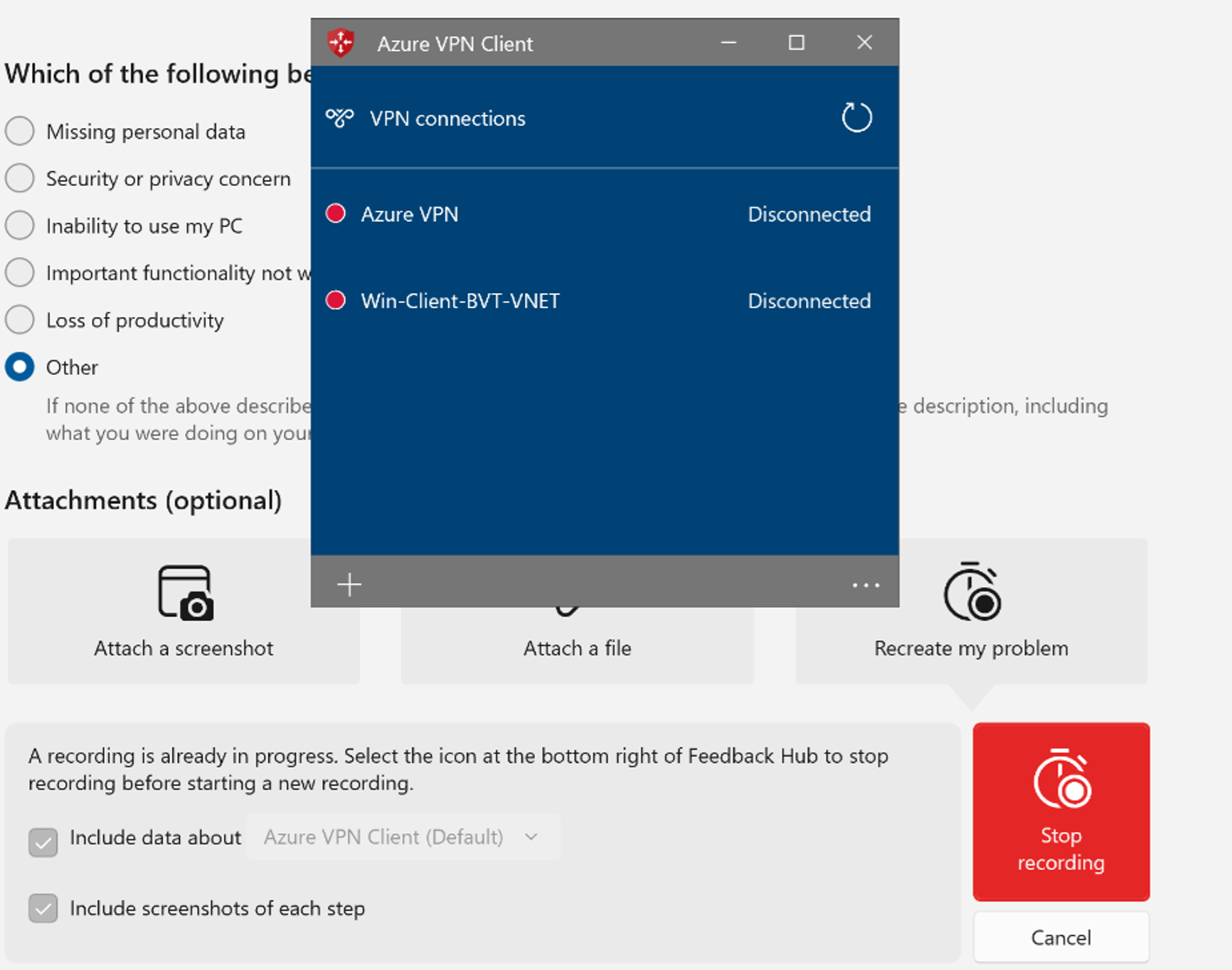 This article helps you report an Azure VPN Client problem or improve the Azure VPN Client experience using the FeedBack Hub app. Use the steps in this article to help collect logs, send files and screenshots, and review diagnostics. The steps in this article apply to the Windows 10 and Windows 11 operating systems and the Azure VPN Client.