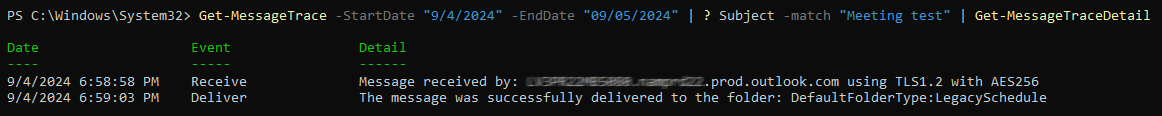For this cause, the value of the Detail parameter for the deliver event is: The message was successfully delivered to the folder: DefaultFolderType:LegacySchedule.