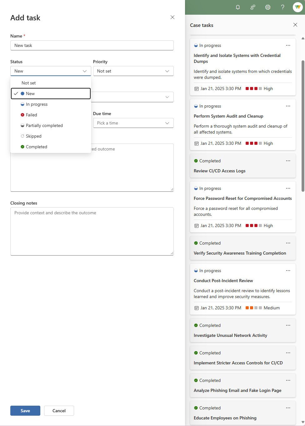 Image shows the following task statuses available: New, In progress, Failed, Partially completed, Skipped, Completed