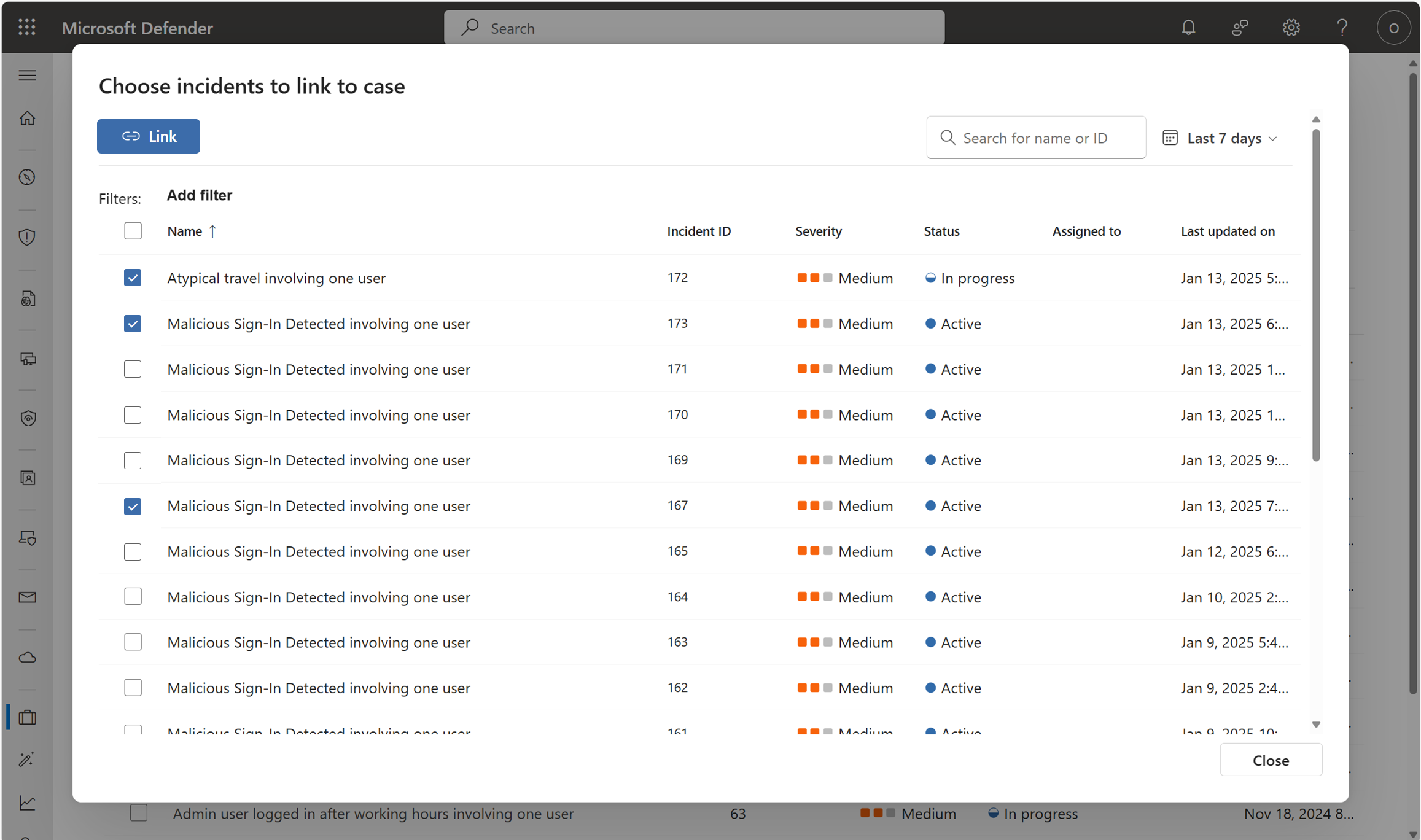 Alternatively, if the IR team needs to escalate one or more incidents to the hunting team, they can create a case and link the incidents from the Investigation & response incident details page.