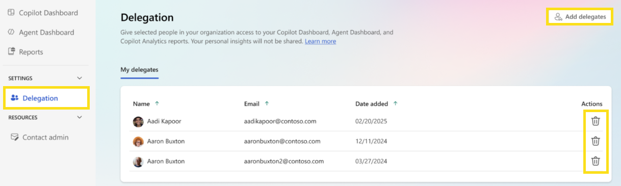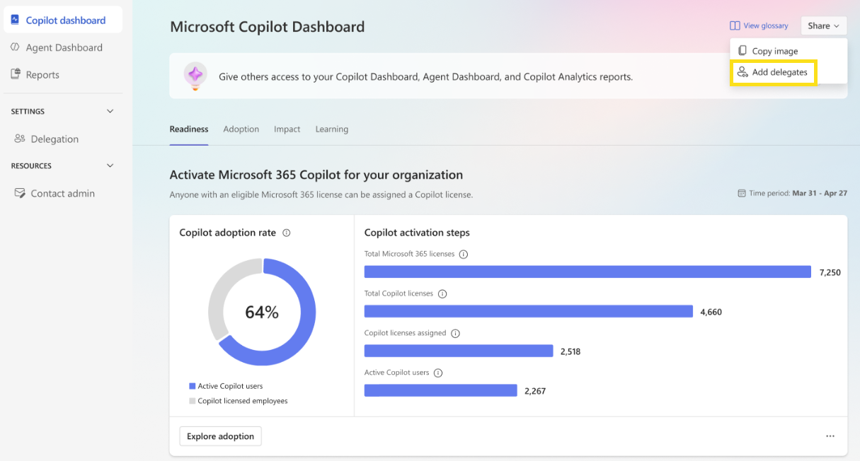 Assign and remove delegates for the dashboards and Copilot Analytics reports