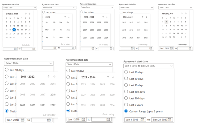 Selection of custom dates follows a five-year window – For example, to select a date from the year 2018, select October 2023 > 2023 > 2023-2024 > Go to the year 2018 for selection. Other dates will be grayed out for selection.