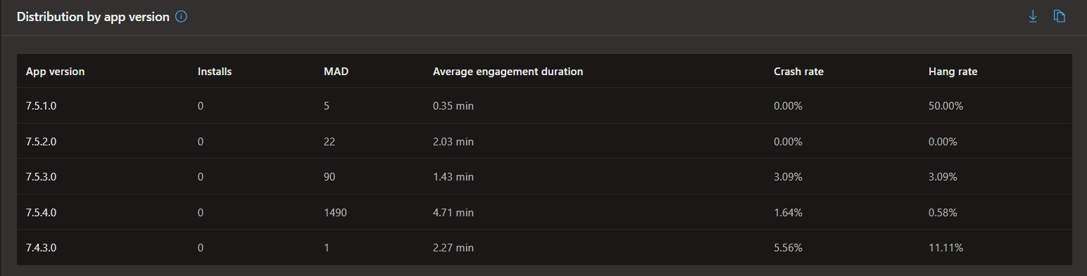 - Distribution by App Version: The dashboard provides a clear breakdown of installs, engagement duration, stability, and usage by app version. Instantly identify which release is driving success, discover versions causing issues, and focus your improvements where they’ll have the most impact.