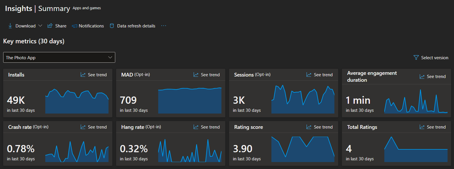 No setup required, just log in to Partner Center, select an app, and explore your metrics under the Summary tab. Use interactive filters to focus on versions or trends and download data for deeper analysis when needed.