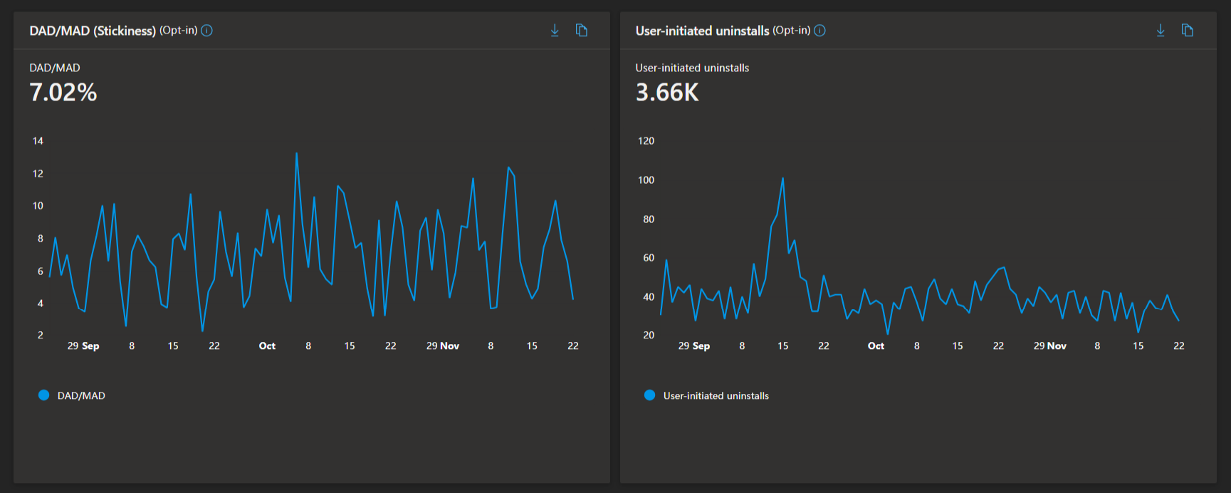 - User-Initiated Uninstalls: Metric and trend graph show daily uninstall counts, helping identify friction points or release issues.
