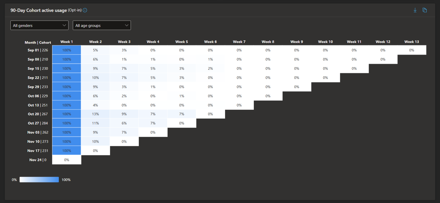 - Cohort Active Usage (90 days): Heatmap traces retention by weekly activity for user cohorts, revealing long-term engagement and where drop-offs occur.