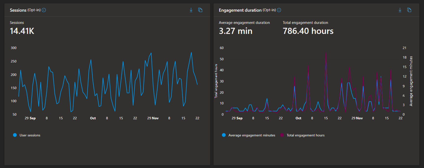- Engagement Duration: View both the average session length (in minutes) and cumulative app engagement in hours over time. Overlayed charts make it easy to contrast session quality with total user commitment.