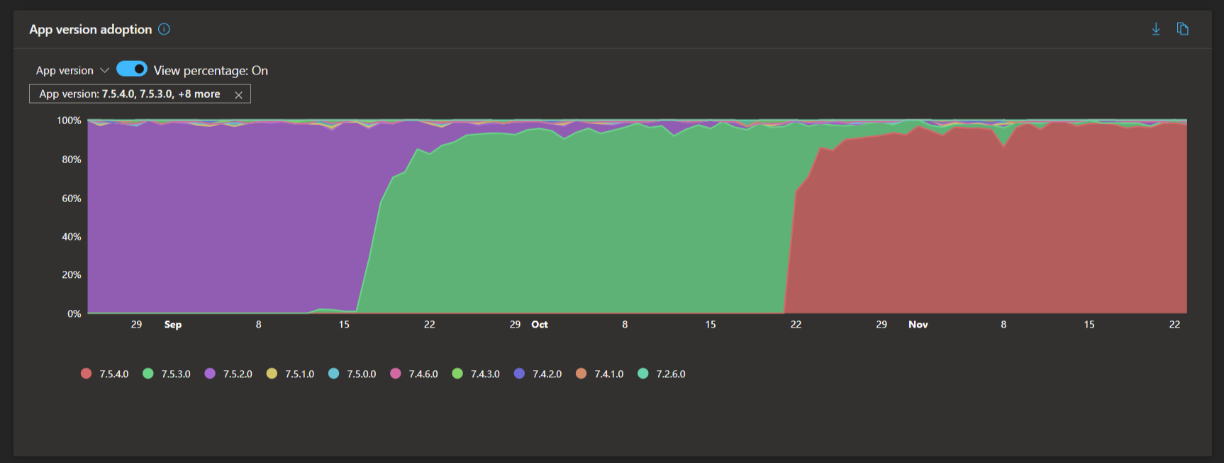 - App Version Adoption Over Time: Stacked area charts visualize how quickly new versions are being adopted and which versions dominate at any point in time.