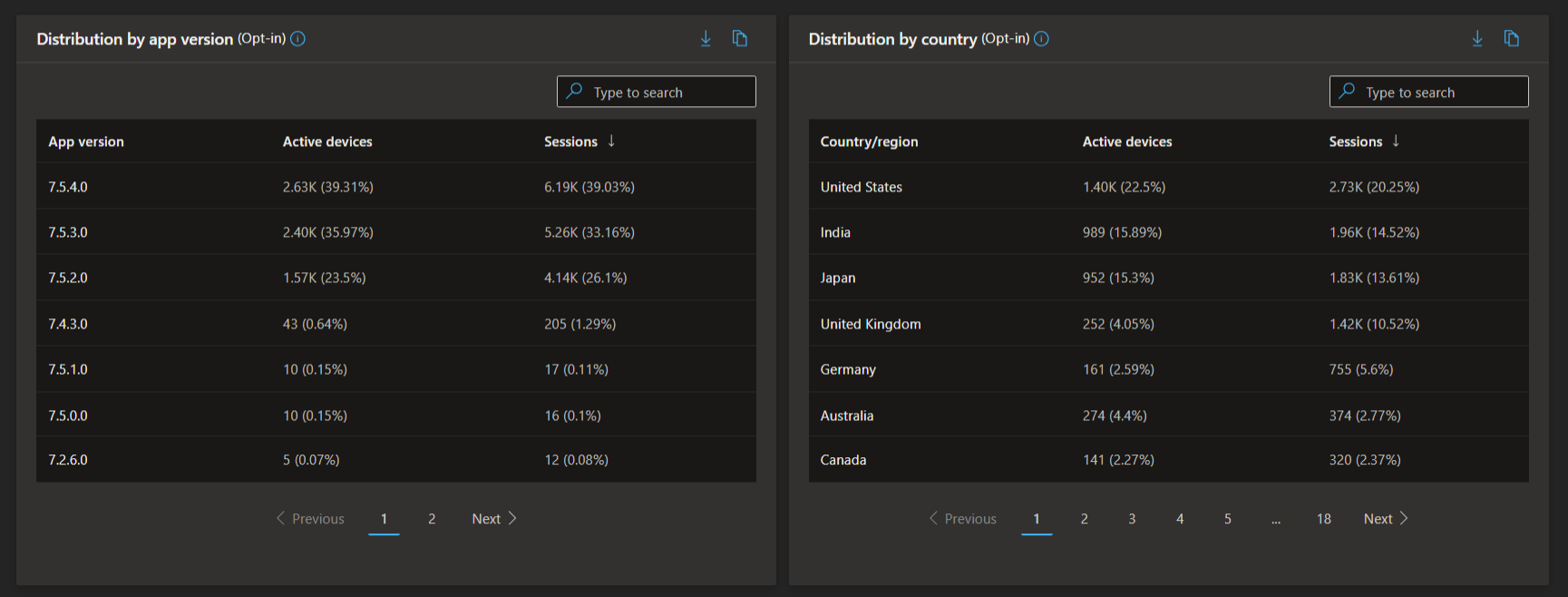 - Country Distribution: Explore regional trends with a table showing active devices and sessions by country or region, supporting global monitoring and targeted analysis.