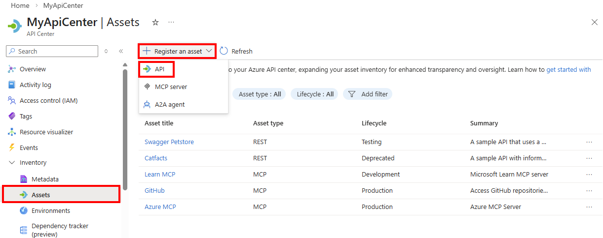 Select + Register an asset > API.