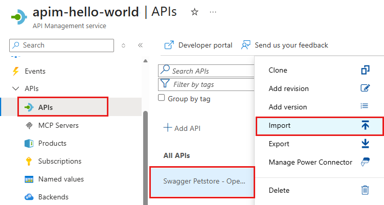 Select APIs on the Overview page or select APIs > APIs in the menu on the left.