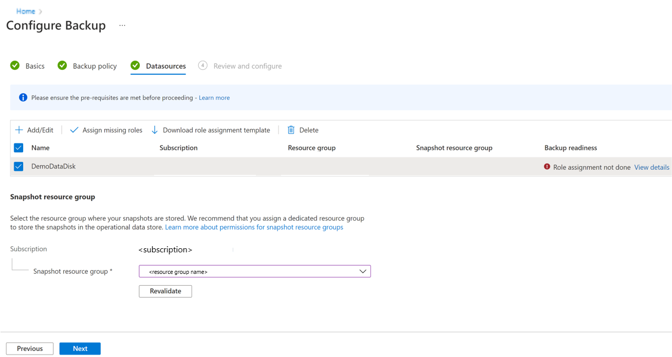 If the Role assignment not done error message displays in the Backup readiness column, the Backup vault managed identity needs role permissions on one or more selected disk(s) and/or on the Snapshot resource group.