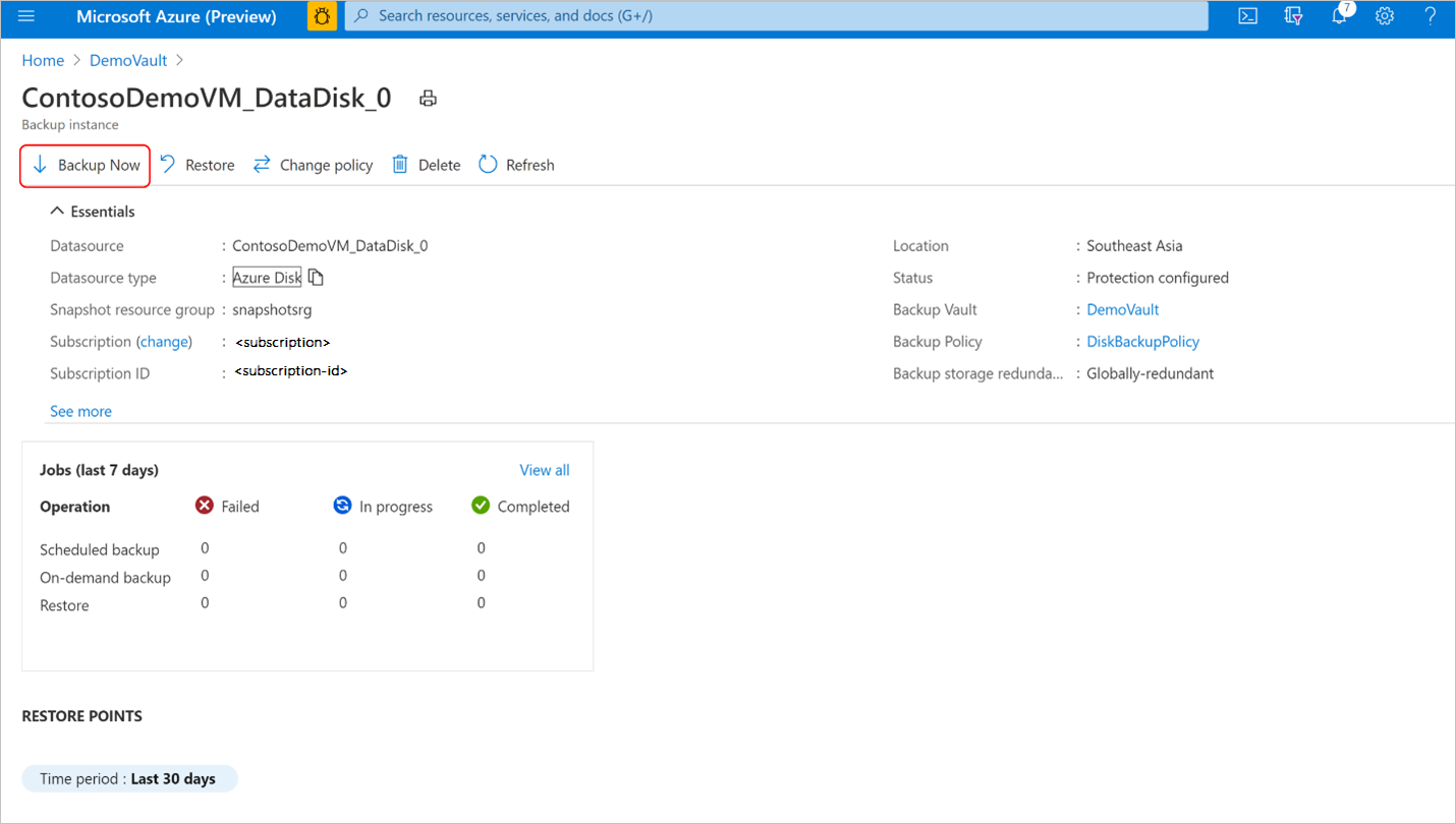 In the DemoVault Backup vault created in the previous step, go to Backup instances and select a backup instance.